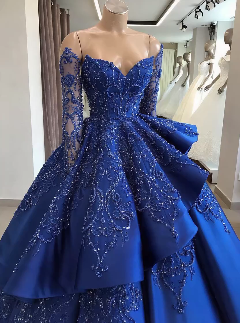 Gorgeous Royal Blue Lace Ruffled Prom Dresses | Strapless Sweetheart Beads Quinceanera Dresses